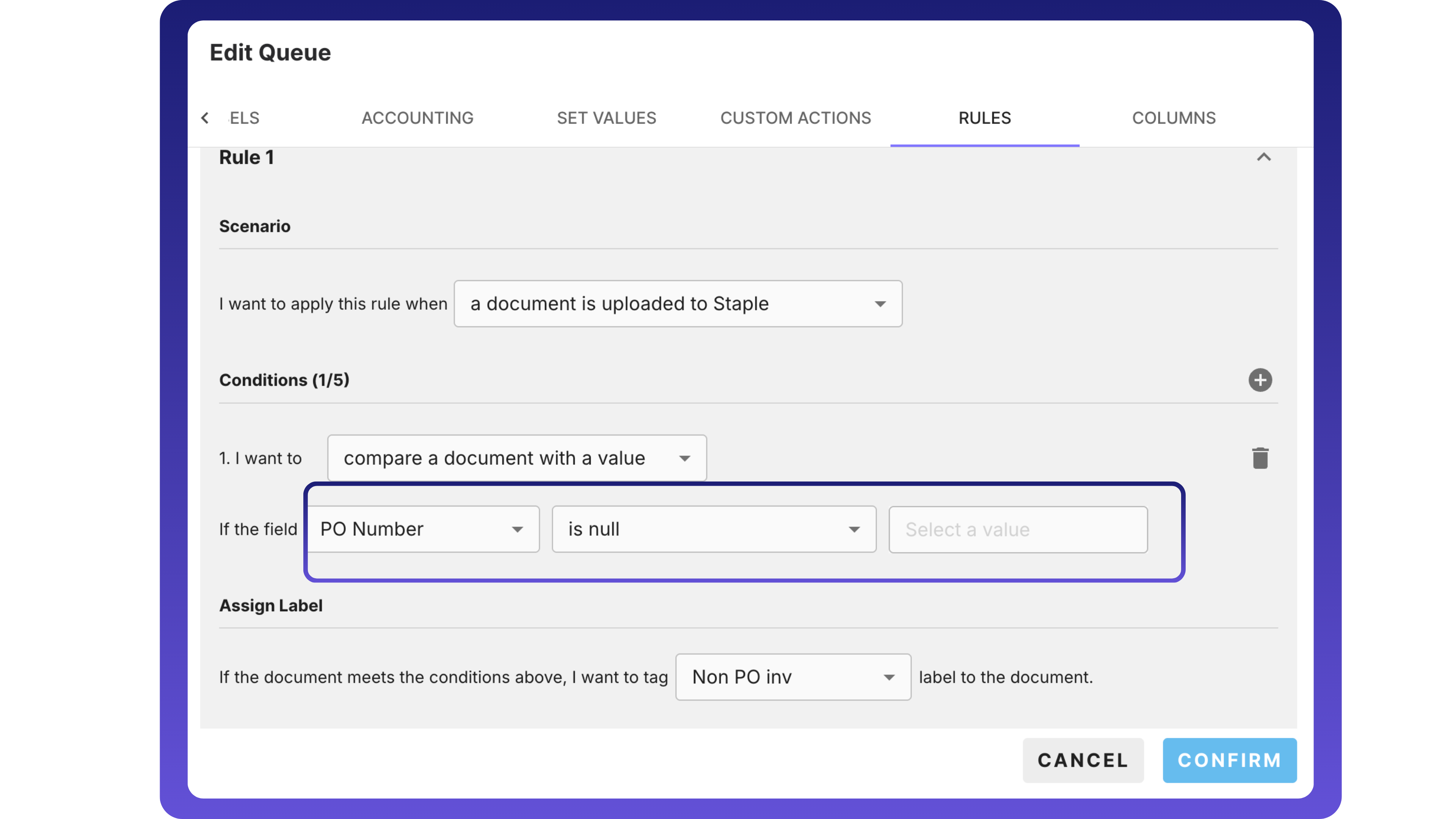 For example: If the PO number field is empty, automatically send the document to "non PO invoice" queue for review.