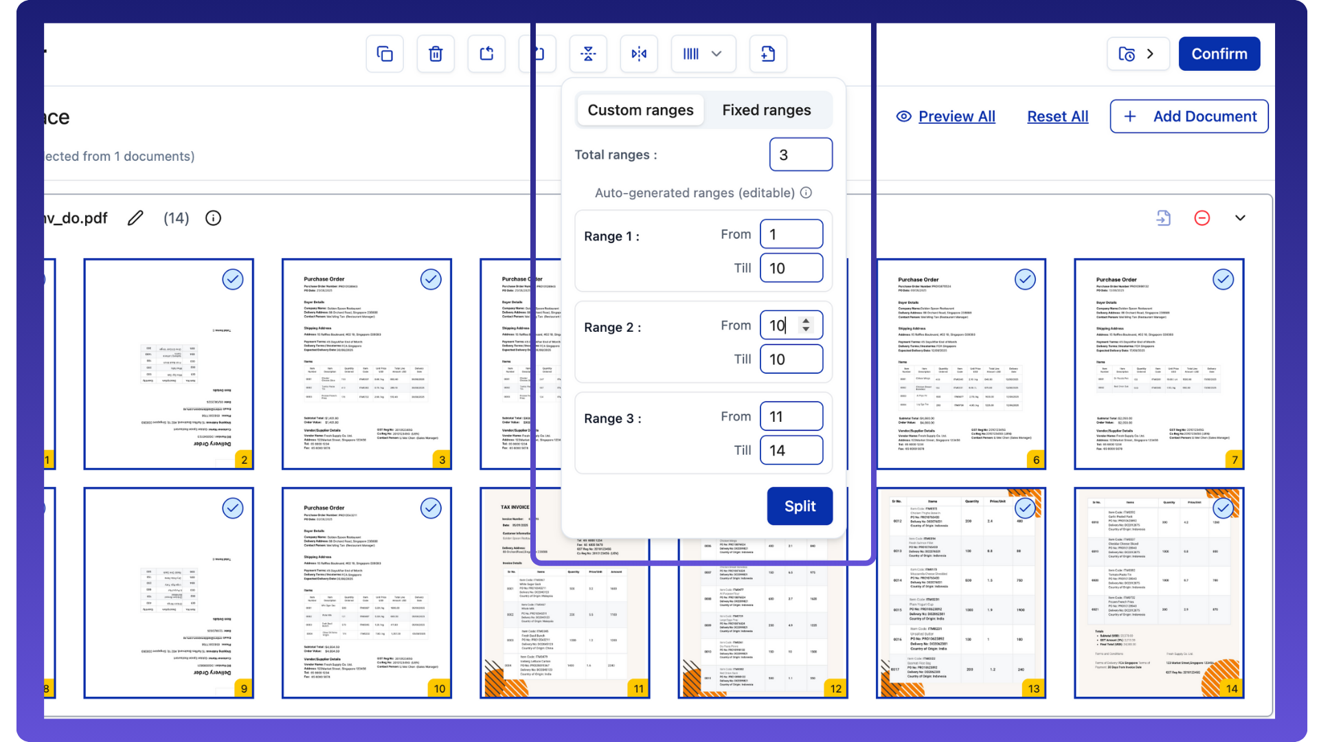 Custom ranges: To split the document into three, you can select the range to 3 and then enter the values of range according to the way you'dl ike to split the parent document.